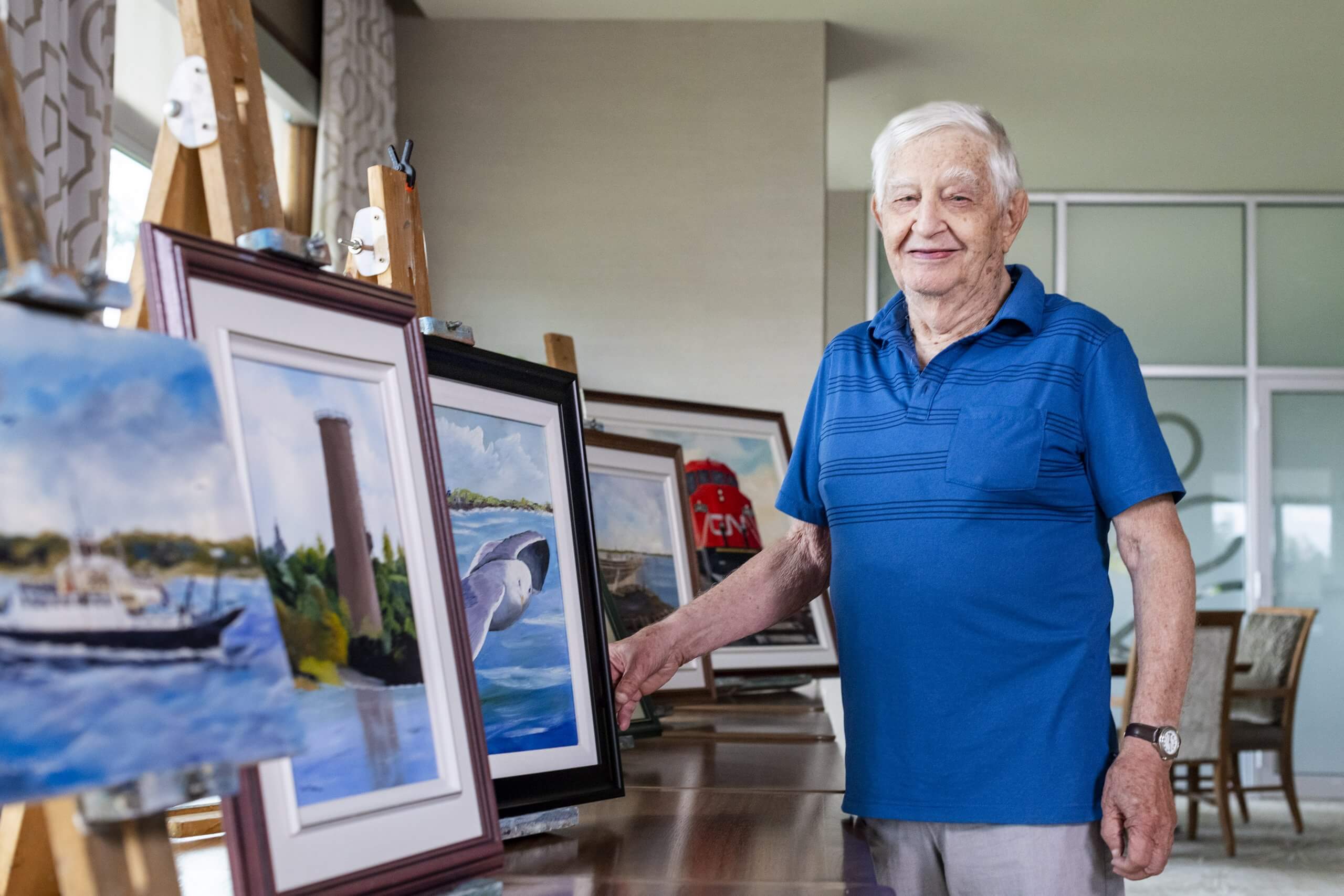 Parkland Clayton Park resident Gary Chamberlain moved in April 2022 and began painting after a 25-year hiatus and spearheaded a small group of like-minded people to join him in a program called Art on Your Own. Gary is joined by another resident and her daughter each Thursday afternoon as they all work on their painting projects together. With the help of the Wellness Coaches, his paintings are on display in the Art & Hobby room.