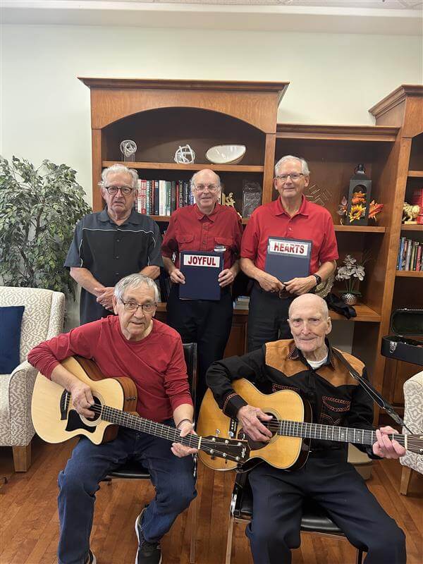 The group’s official name, Joyful Hearts, came about in a memorable way. One afternoon, residents gathered in Harris Hall to rehearse a country classic, Picture in a Frame by Moe Bandy. With only acoustic guitars, the music sounded so good that when the last note faded, John exclaimed, “I think we just formed a band!” Everyone agreed, and when someone suggested “Joyful Hearts,” the name stuck. It perfectly captured the spirit of their sound: uplifting, warm, and full of joy.