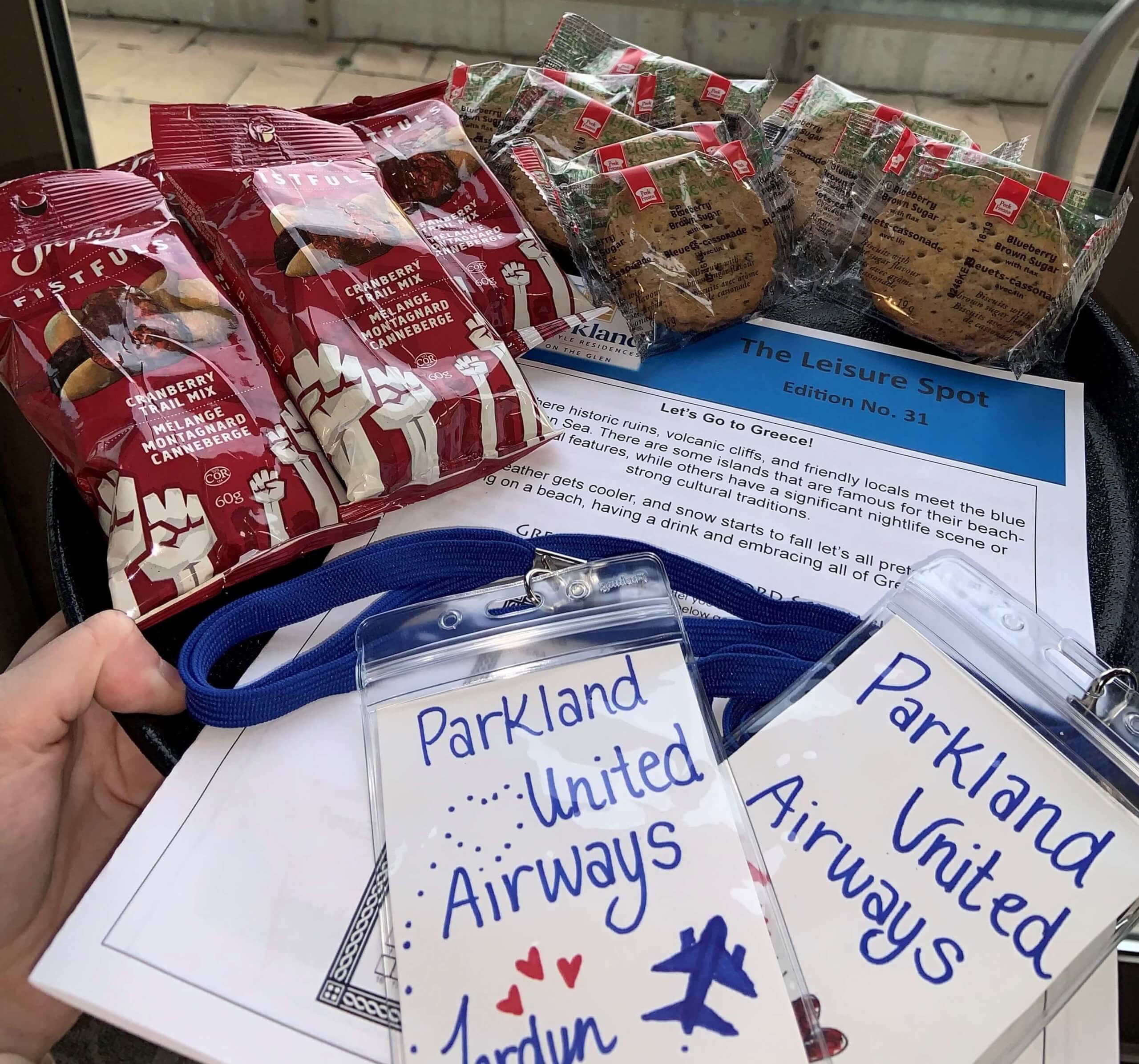 “In the afternoon we dressed up as flight attendants and made name badges that said Parkland United Airways,” says Amanda. “We then went around for all residents, knocked on the door and offered them an in-flight snack of trail mix or cookies for their flight to Greece. The residents absolutely loved it.”